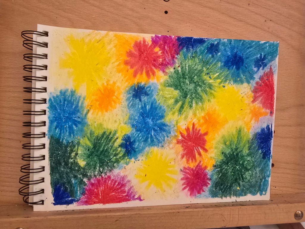 Today I felt like colors, not shapes and lines, and for some reason I chose the most arm-workout medium at my disposal: oil pastels.